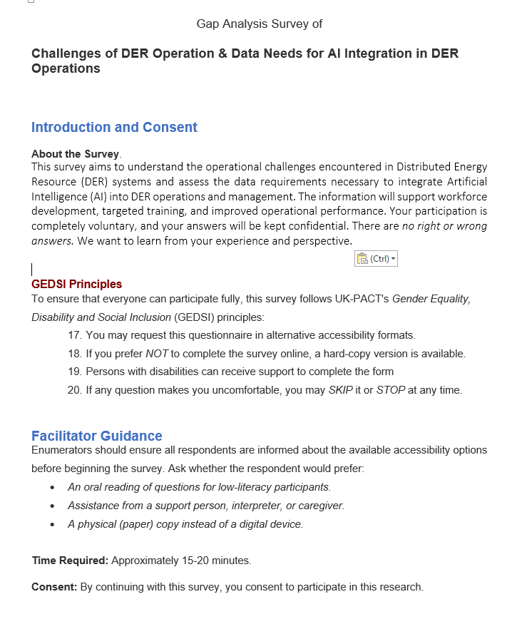 This survey aims to understand the operational challenges encountered in Distributed Energy Resource (DER) systems and assess the data requirements necessary to integrate Artificial Intelligence (AI) into DER operations and management. The information will support workforce development, targeted training, and improved operational performance. Your participation is completely voluntary, and your answers will be kept confidential. There are no right or wrong answers. We want to learn from your experience and perspective.